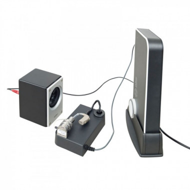 Equipamento audiômetro com 2 canais totalmente independente, projetado para ser um equipamento portátil e que atenda a necessidade de um atendimento domiciliar mais completo sem necessidade de conectar a rede elétrica. Permite mostrar figuras como exemplo da região sonora.