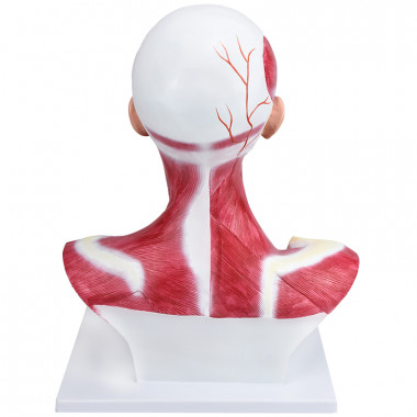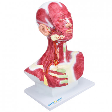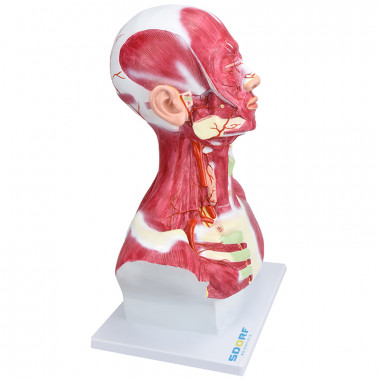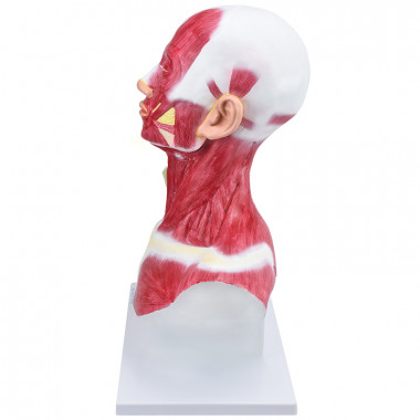Modelo anatômico de cabeça e pescoço com musculatura superficial, confeccionado em resina plástica e com pintura feita à mão e cores realísticas.