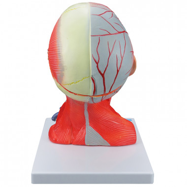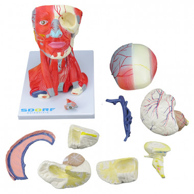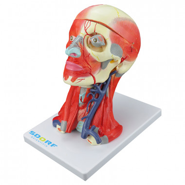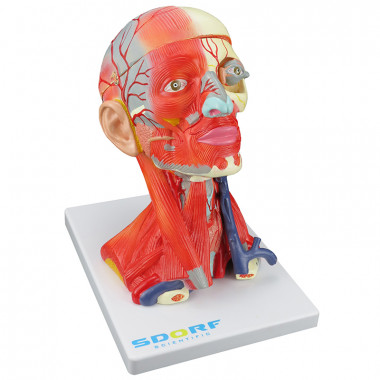 Modelo anatômico de cabeça e pescoço musculados em 10 partes, é confeccionado em resina plástica e representa a anatomia muscular superficial e profunda da cabeça e do pescoço, mostrando ainda, nervos, osso e parte vascular; pintado a mão, muitos detalhes anatômicos podem ser facilmente identificados;