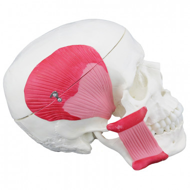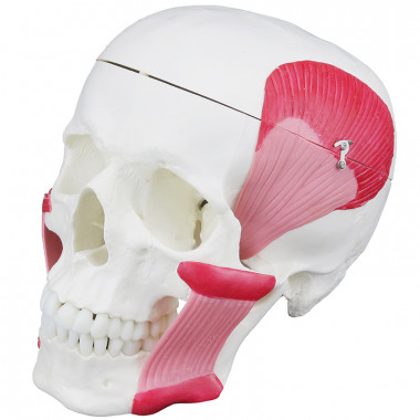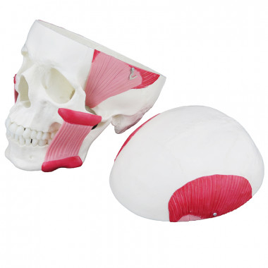Modelo anatômico de crânio com músculos da mastigação, confeccionado em PVC e resina plástica emborrachada, este modelo apresenta grande detalhamento anatômico;