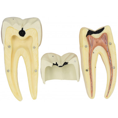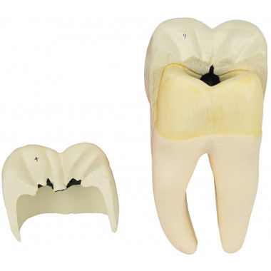 Modelo anatômico de dente molar inferior com raiz dupla, dividido em 3 partes e com apresentação de cárie, 8 vezes o tamanho real, confeccionado em PVC especial e com pintura feita a mão, com conexões feitas por imãs, este modelo apresenta com grande riqueza de detalhes a anatomia deste dente; 9 estruturas estão numeradas para uma identificação ainda mais fácil e prática;