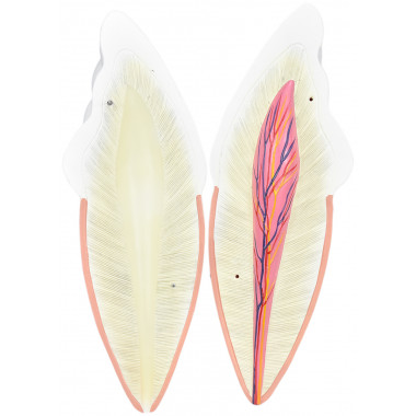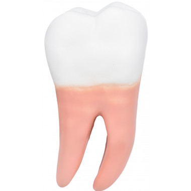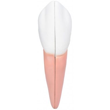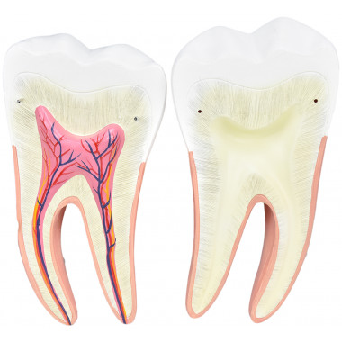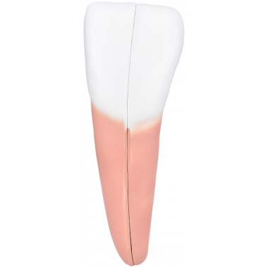 Modelo anatômico de dentes em 6 partes, ampliados em aproximadamente 10 vezes, confeccionados em PVC, com pintura feita a mão e cores realísticas para facilitar a aprendizagem; composto por 3 diferentes dentes sendo: Incisivo, Canino e Molar com duas raízes, todos os dentes possuem uma secção sagital;