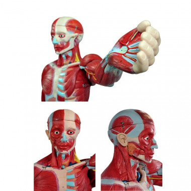 Figura muscular assexuada em tamanho natural, confeccionada em PVC e Resina Plástica Emborrachada, com reprodução detalhada da musculatura humana de 1,70 de altura com órgãos internos e dividia em 29 partes;