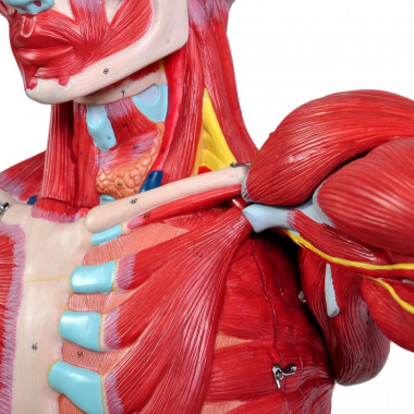 Com este modelo anatômico SD-5026, é possível estudar de forma detalha a musculatura superficial, a musculatura profunda e também, vasos e nervos; Esta figura oferece condições de estudos detalhados das seguintes partes: