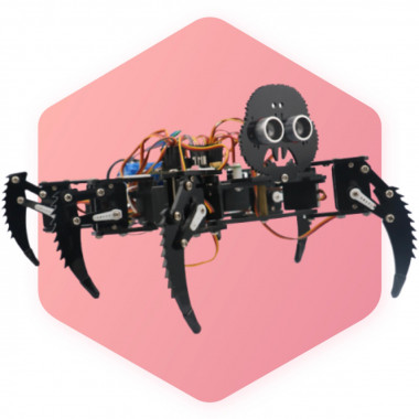 Robô Articulado com 6 Pernas e 12 articulações. Já vem pré-programado para montagem e uso direto, para ensino de conceitos de mecânica, eletrônica e programação. Possui controlador compatível com ambiente de desenvolvimento do Arduino.