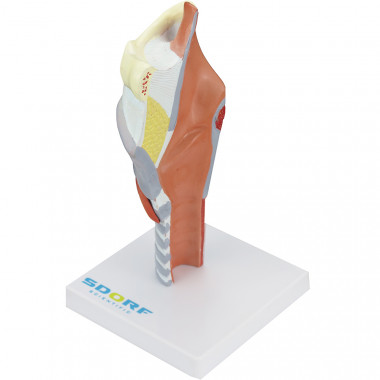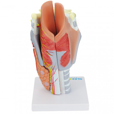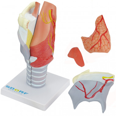 Modelo anatômico de laringe humana ampliada com cartilagens em 5 partes confeccionado em PVC com pintura feita à mão e cores realísticas;