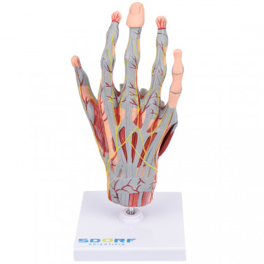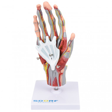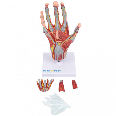 Modelo anatômico de mão com músculos destacáveis em 5 partes, confeccionado em resina plástica especial, pintura feita à mão e cores realísticas. Apresenta alta fidelidade anatômica; Este modelo anatômico evidencia de forma clara as seguintes estruturas: Músculos, Vasos sanguíneos, Artérias, Tendões e Ossos; Com o modelo anatômico de mão musculado em tamanho real em 5 partes SD-5027/C é possível identificar os seguintes ossos entre outras estruturas: