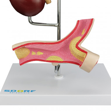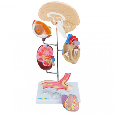 Modelo anatômico patológico de órgãos afetados pela hipertensão em oito partes, confeccionado em resina plástica com pintura feita à mão e cores realísticas para facilitar o estudo da anatomia e patologia destes órgãos;