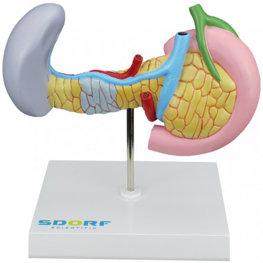 Modelo anatômico patológico do pâncreas, baço, duodeno e vesícula biliar em tamanho real, confeccionado em resina plástica com pintura feita à mão e cores realísticas para facilitar o estudo;