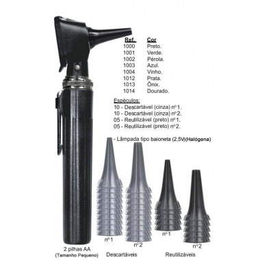 O Mini Otoscópio Mikatos é um equipamento portátil especifico para examinar as partes internas do ouvido, tendo como componentes principais: espéculos com diversos tamanhos para adaptar ao ouvido de cada paciente, lâmpada tipo baioneta (encaixe) para iluminar através de feixe de luz concentrado e uma lente com aumento de 2,5 vezes para uma análise com excelente nitidez. O espéculo é introduzido no ouvido do paciente, possibilitando ao profissional a amplitude e iluminação suficientes para um diagnóstico detalhado e preciso.