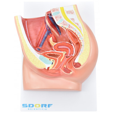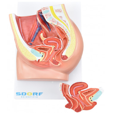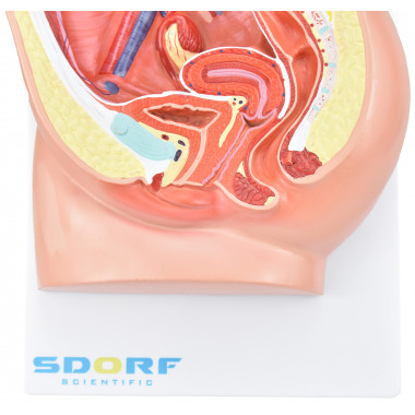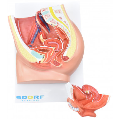 Modelo anatômico de pelve feminina com secção em duas partes, em corte sagital apresentando músculos, vasos, ossos e nervos confeccionado em PVC, pintura feita à mão e cores realísticas; Apresenta alta fidelidade anatômica com genital feminina conectada por sistema de ímãs;