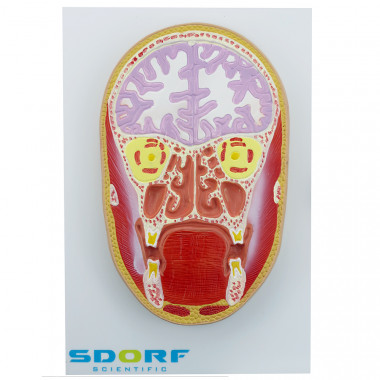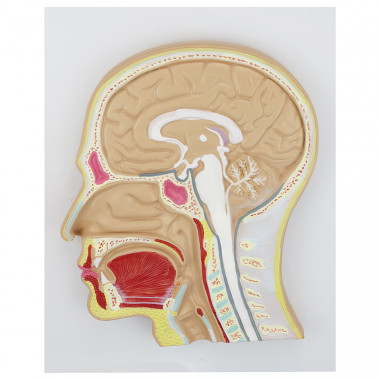 Modelo anatômico de secção frontal e mediano da cabeça, confeccionado em PVC; este modelo anatômico oferece com riqueza de detalhes as estruturas presentes na cabeça; Com o modelo anatômico de secção frontal e mediana da cabeça SD-5038/B é possível identificar as seguintes estruturas dentes outras: