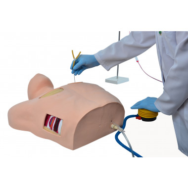 Simulador de drenagem torácica; Confeccionado em PVC, resina plástica emborrachada siliconada e membrana gelatinosa; O modelo SD-4045 é um simulador indicado para o treinamento de: Pneumotórax Hipertensivo Bilateral; Toracocentese, Hidropneunotorax; Colocação de Dreno; Este modelo representa o tórax de um paciente adulto, nele é possível identificar as estruturas anatômicas que orientam os procedimentos tais como: Abdômen; Tórax, Processo Xifoide, Esterno, Peitoral Maior; Grande Dorsal; Manúbrio, Clavículas, Costelas.